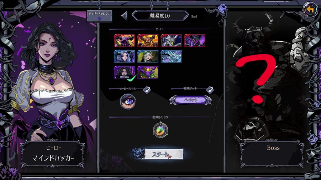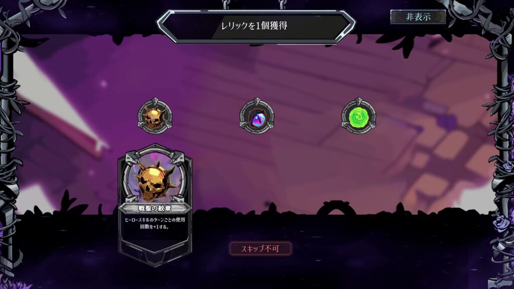 最初のレリックは、ヒーロースキルのターンごとの使用回数を+1する戦聖の紋章。マインドハッカーのヒーロースキルは、ランダムな 2 体のスキルを呼び出す強力なものであるが、1 体につき 1 回しか発動できないため、序盤は使いづらい。