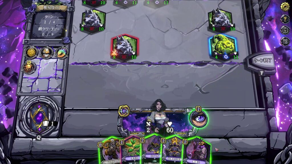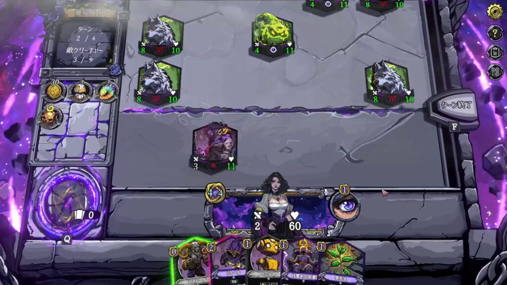 戦闘開始。次々と襲いかかるウェーブを、カードバトル形式でしのいでいくというゲーム。このゲームの特徴として、永続強化が多く、味方クリーチャーの能力がどんどんスケーリングしていき、育成が楽しめる。最初のパックから、芽生えというライフ増強呪文を受け取って、魔闘士を主軸とした構成を狙う。