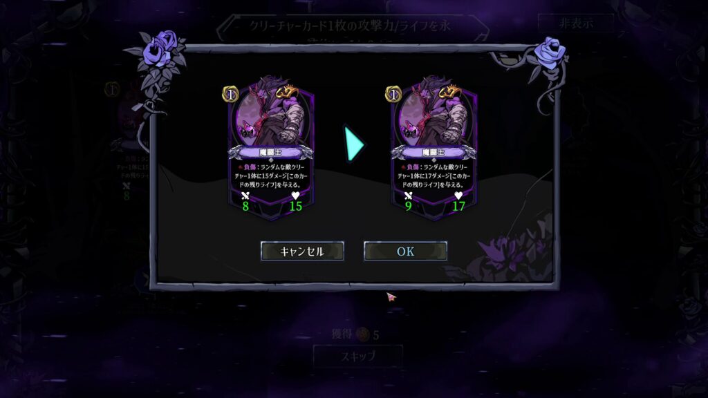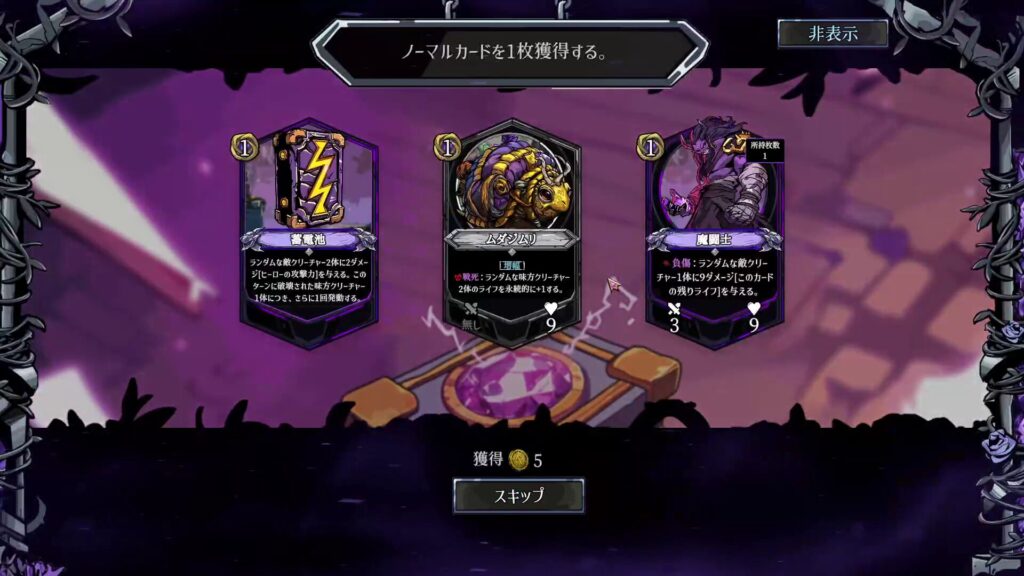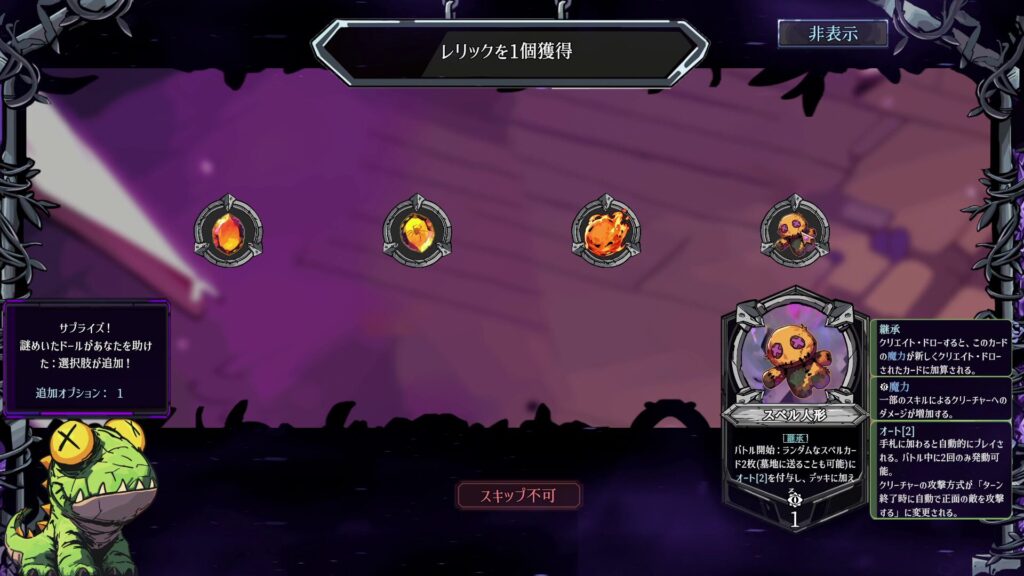 報酬のレリックとして、スペル人形を獲得。バトル開始時にランダムな 2 枚のスペルにオートを付与してデッキに加えるというもの。良いスペルが来てくれれば良いのだが。