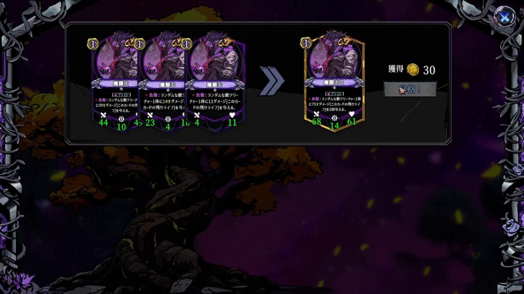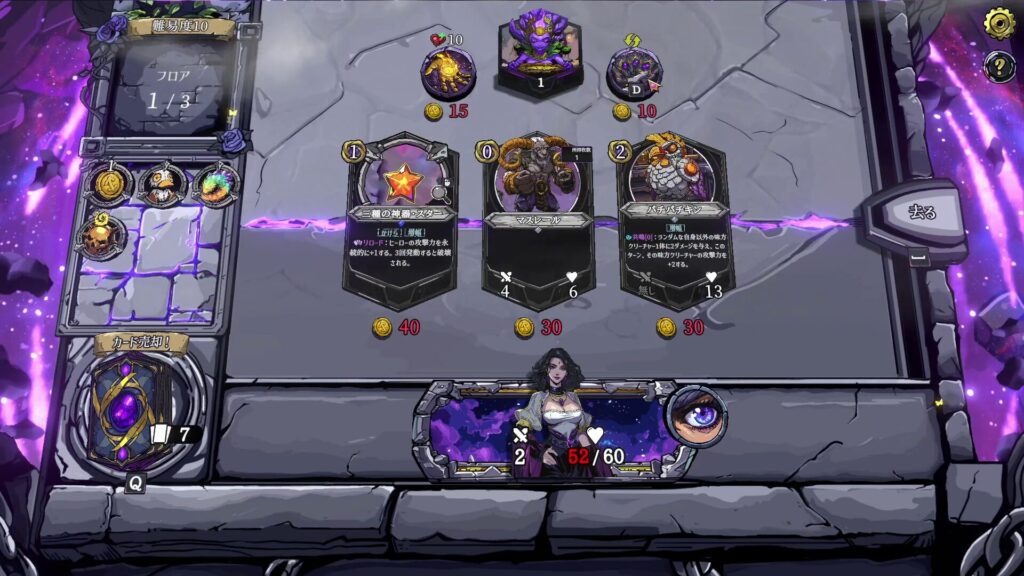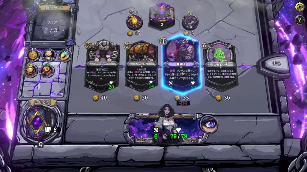 このゲームは、同じカードを 3 枚揃えると 1 度だけ昇格できるシステムである。魔闘士の 2 枚目を運良く序盤で引けたため、このまま昇格を狙ってショップへ突入する!