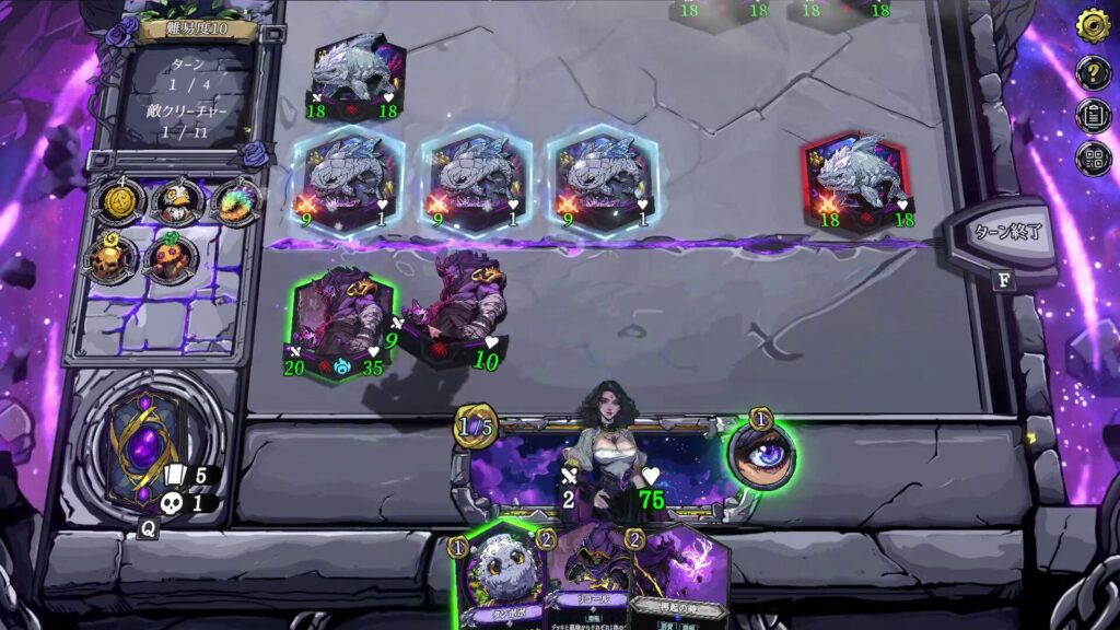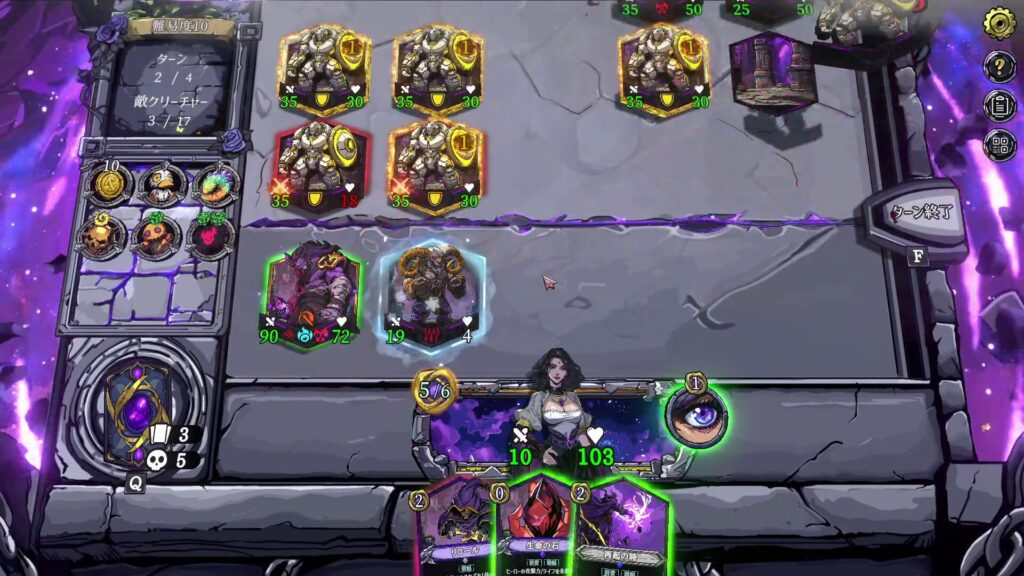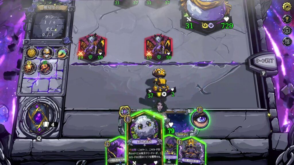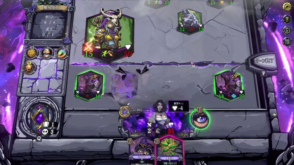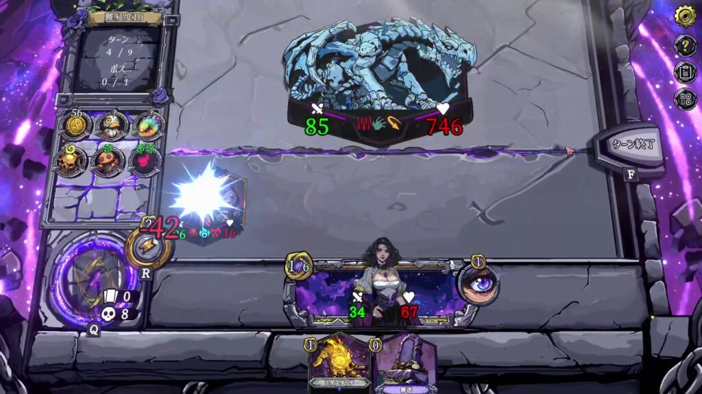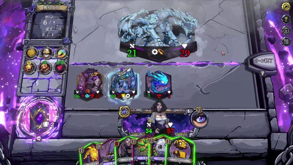 フロア 2 のボス。クリーチャーを 4 体並べると攻撃x2 のダイレクトアタックが来る。なお、デッキにはクリーチャーが 3 体しかいないので余裕となっている。