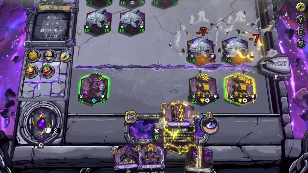このカタザメという敵は、負傷時に半分の攻撃力をもつミニオンを召喚する。18点のライフをなるべく一撃で削らないと、ボードが埋め尽くされて攻撃を受けてしまうだろう。