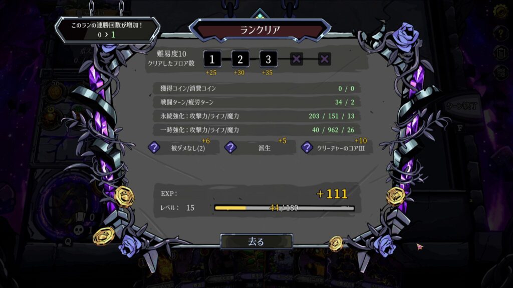 戦闘の規定ターンを超えると、疲労ダメージを受けてしまう。しかし、意を決した総攻撃によってボスを撃破、フロア 1 攻略。