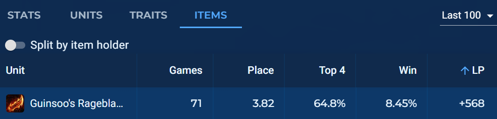 guinsoo オンライン。このアイテムは、通常攻撃主体ユニットしか使えなかった気がするが、いつの間にかリメイクされており、しかも、AS でスキルのアニメーション速度が上昇するようになっていた。よって、アニメーションが遅い Jhin などが最強になるため、そのまま Yunara に渡すという方法で利用される。一方でスキルのアニメーションが早くならないユニットもいるようで、Vayne は guinsoo を主に利用しない。わかりにくすぎる。