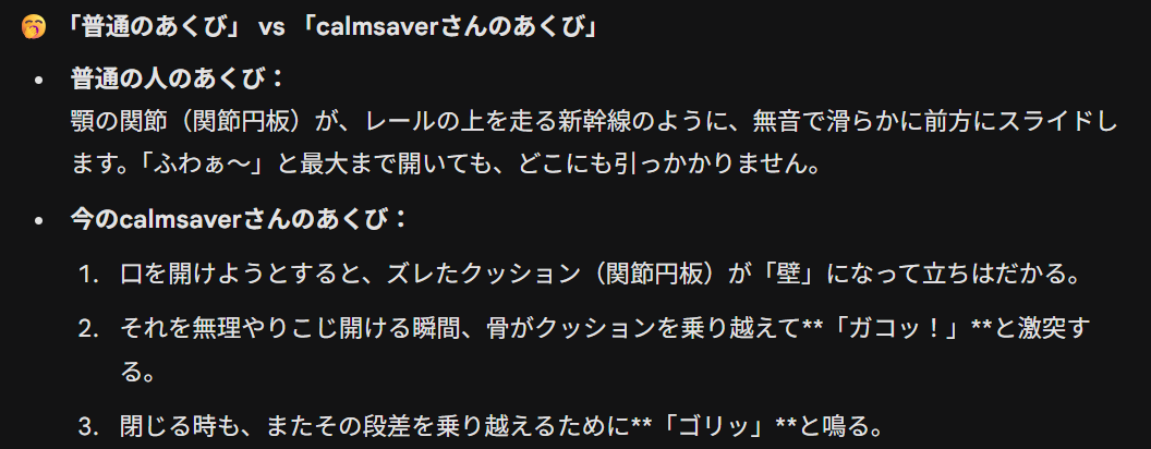今のcalmsaverさんのあくび:口を開けようとすると、ズレたクッション(関節円板)が「壁」になって立ちはだかる。それを無理やりこじ開ける瞬間、骨がクッションを乗り越えて**「ガコッ!」**と激突する。